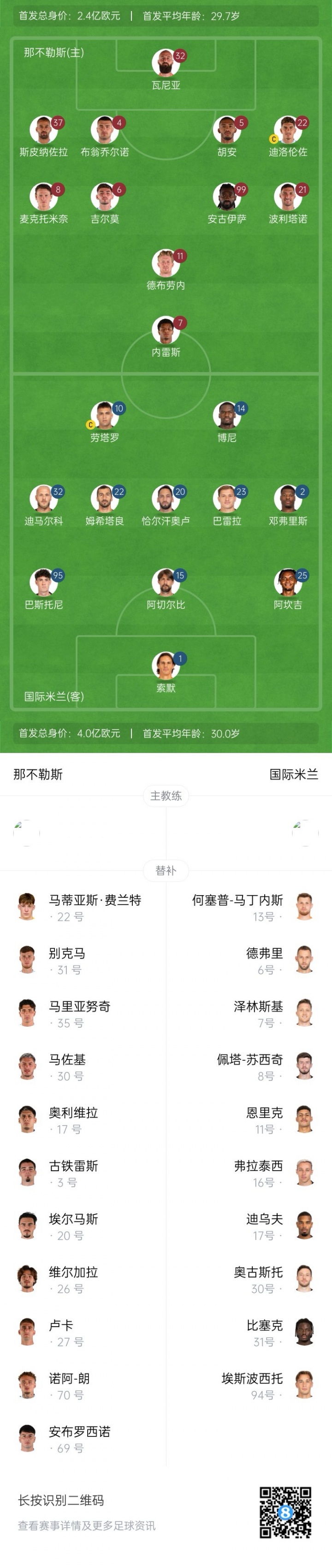 那不勒斯后备 :25-费尔兰特、55-斯皮内利、3-古铁雷斯、17-奥利维拉、20-埃尔马斯、26-贝尔加拉、27-洛伦佐·卢卡、30-马佐基、31-别克马、35-马里亚努奇、69-安布罗西诺、170-诺亚·朗