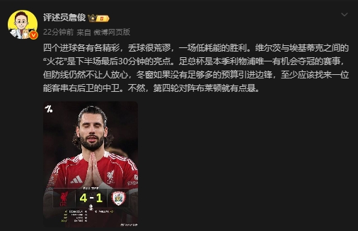 01月13日讯 足总杯第3轮,利物浦4-1战胜英甲球队巴恩斯利,晋级下一轮 下一轮,将对阵布莱顿。赛后,评述员詹俊对赛事 做出点评。