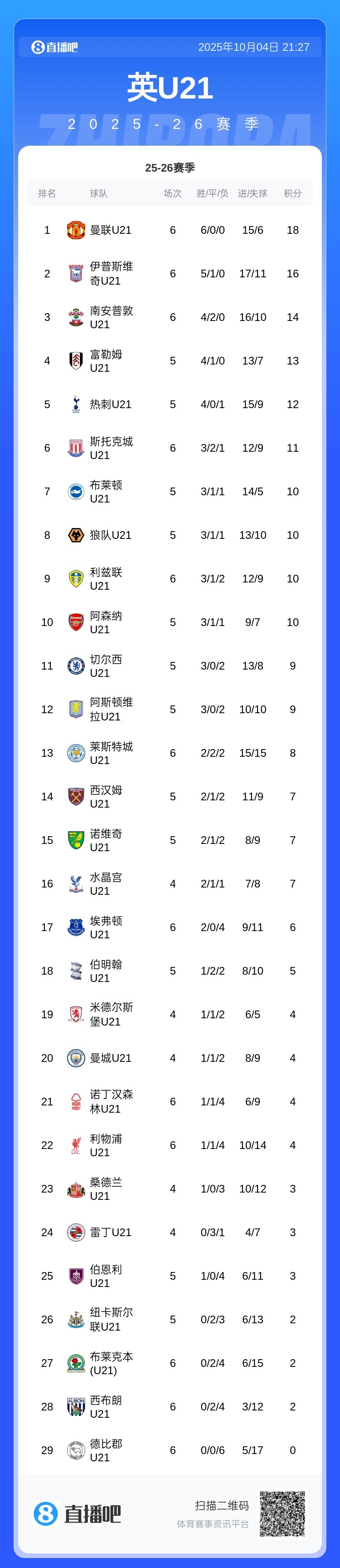 10月4日讯 英超U21职业联赛 第6轮,曼联U21队2-1击败埃弗顿U21队。红魔青年军本赛季至今职业联赛 6战保持全胜,领跑积分榜。